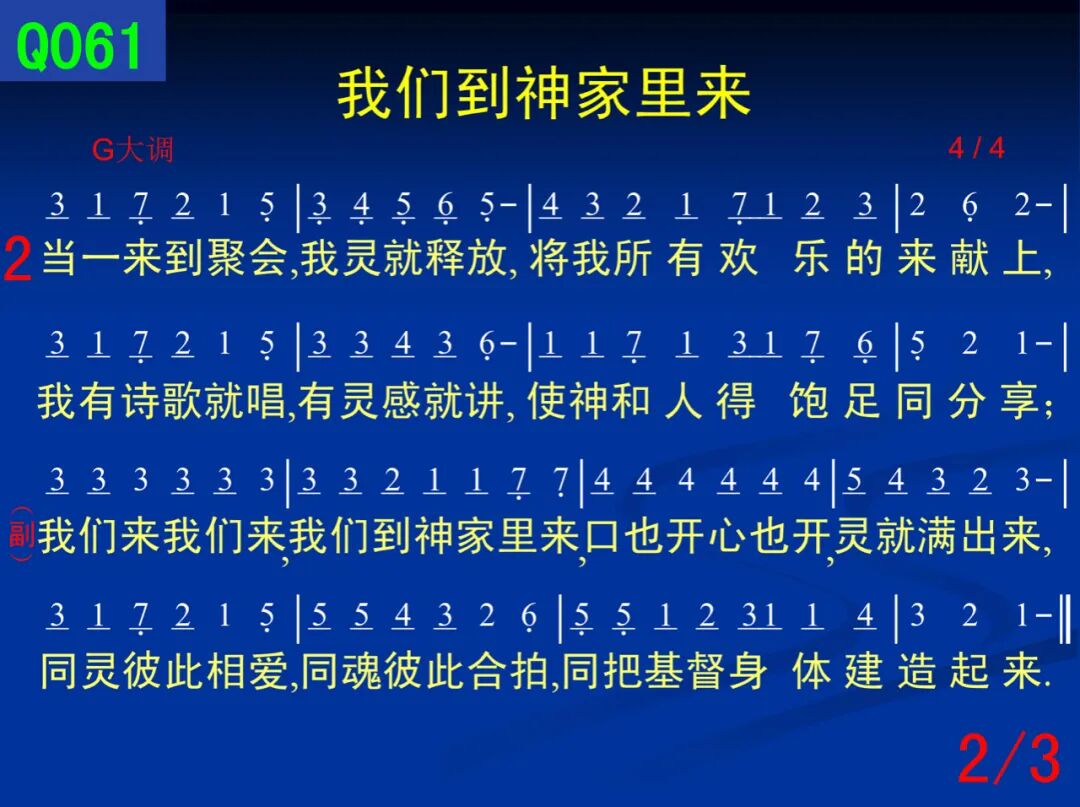 ****我们要到神家里去敬拜, ****我口唱着诗歌,心情多开怀, ****所有捆绑和忧愁全抛开; ****二、 ****当一来到聚会,我灵就释放, ****将我所有欢乐的来献上, ****我有诗歌就唱,有灵感就讲, ****使神和人得饱足同分享; ****三、 ****每逢这样聚集,神前来相会, ****没有什么比这事更宝贝, ****共同展览基督,实在真有味, ****个个肢体尽功用何等美。 ****副: ****我们来我们来,我们到神家里来, ****口也开心也开,灵就满出来, ****同灵彼此相爱,同魂互相合拍, ****同把基督身体建造起来。