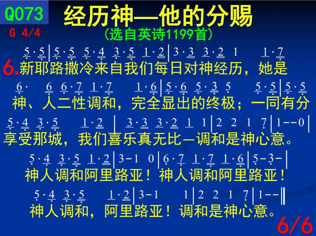 一、 神的旨意在这宇宙,全在祂与人关系, 为此主成那灵,进入人灵,与人调为一。 我们为此欢喜,因能有分神永远旨意--调和是神心意。 二、 人里有一比心思、情感、意志更深之地, 是神所造的灵,好使人能盛装祂自己。 他且要从人灵里涌出,像江河无止息--调和是神心意。 三、 在主恢复中,我们已看见神永远心意, 就是凭祂而活,天天经历祂神圣三一; 转回我们的灵,一直留在调和的灵里--调和是神心意。 四、 我们看见人子,在灯台中间保养顾惜, 眼目如火,双脚像铜,为神的恢复效力; 祂要完成神的旨意,以得着团体实体--调和是神心意。 五、 我们何等需要更深经历与神调为一, 行事为人、言语思想,更多得着祂自己。 为着调和,我们愿意奉献,全照祂心意--调和是神心意。 六、 新耶路撒冷来自我们每日对神经历, 她是神、人二性调和,完全显出的终极; 一同有分享受那城,我们喜乐真无比--调和是神心意。 副: 神人调阿利路亚!神人调和阿利路亚! 神人调和,阿利路亚!调和是神心意**