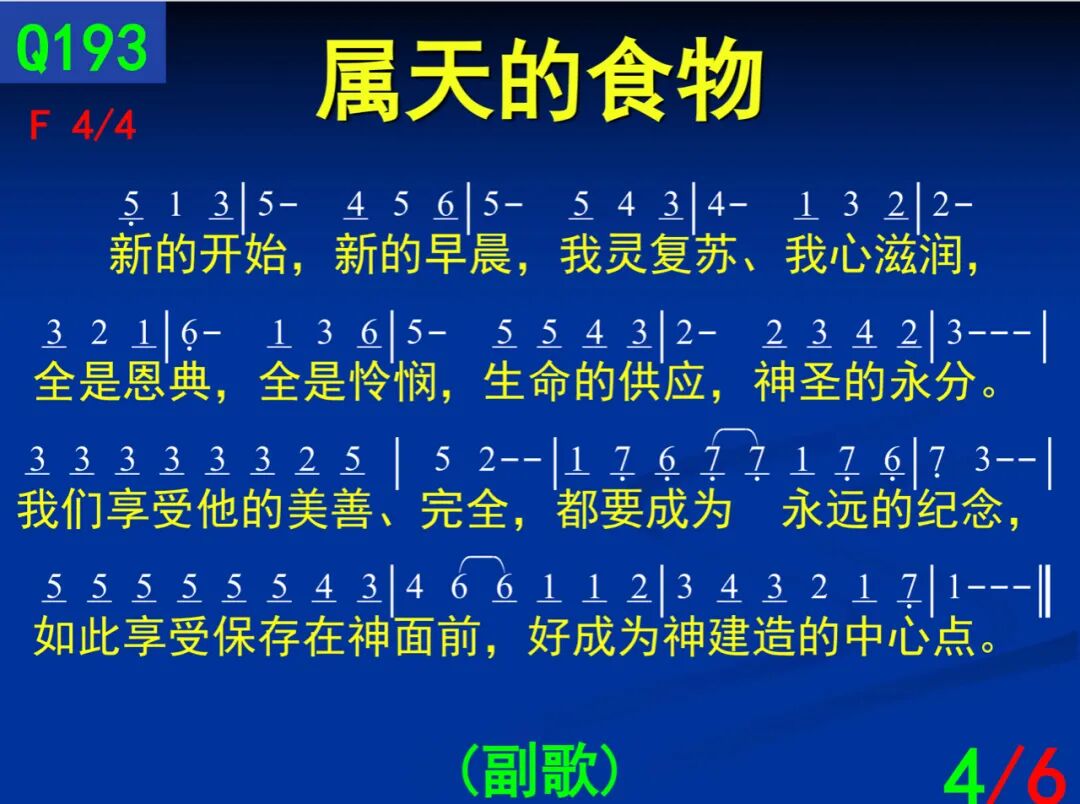副:新的开始,新的早晨,我灵复苏,我心滋润,全是恩典,全是怜悯,生命的供应,神圣的永分,我们享受祂的美善、完全,都要成为永远的纪念,如此享受保存在神面前,好成为神建造的中心点