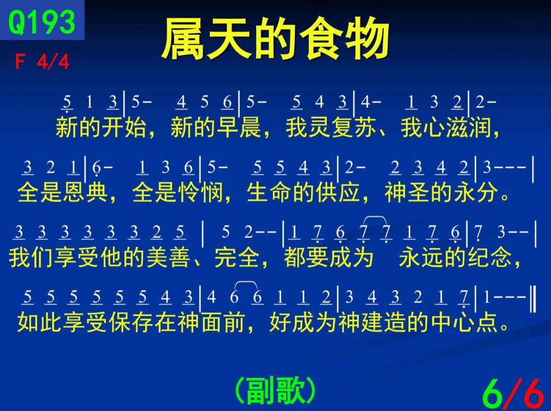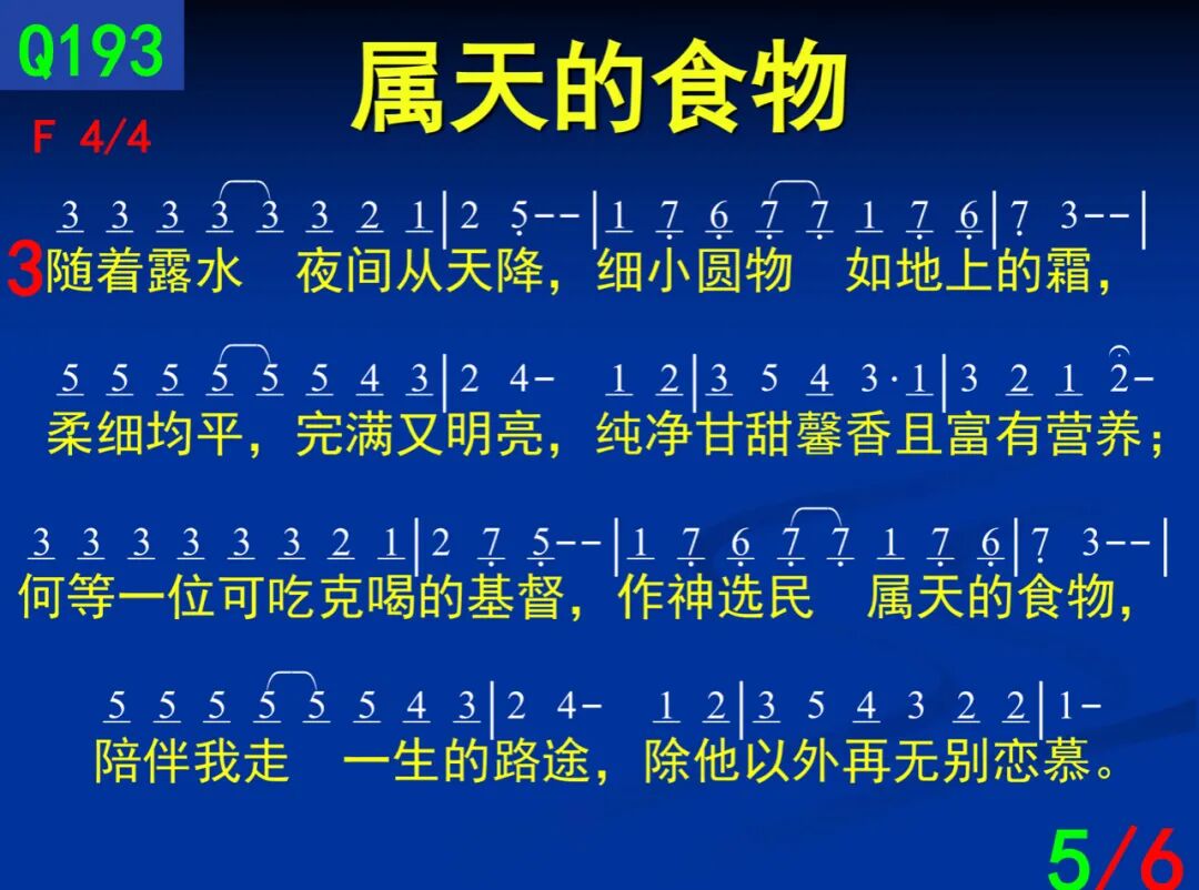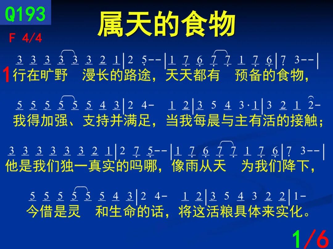 一:行在旷野漫长的路途 ,天天都有预备的食物,我得加强支持并满足,当我每晨与主有活的接触;祂是我们独一真实的吗哪,像雨从天为我们降下;今借是灵和生命的话,将这活粮具体来实话。