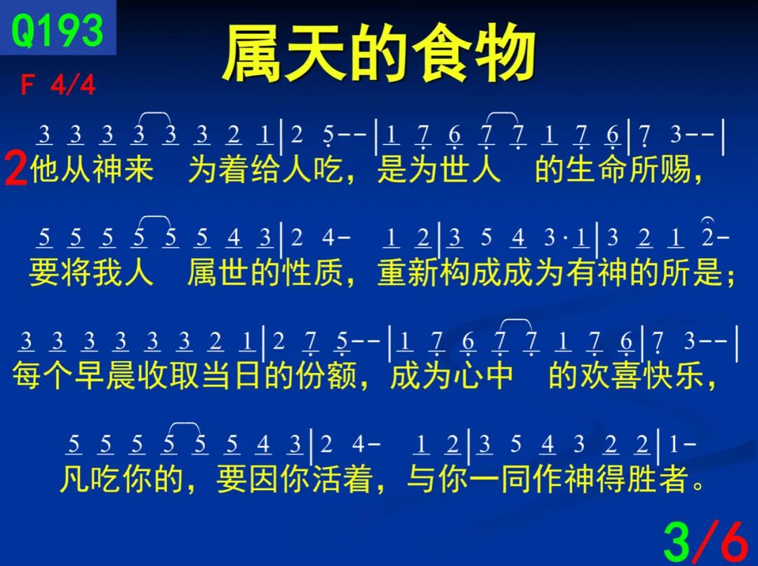 祂从神来为着给人吃,是为世人的生命所赐,要将我人属世的性质;重新构成成为有神的所是;每个早晨收取当日的份额,成为心中的欢喜快乐,凡吃你的,要因你活着,与你一同作神得胜者。
