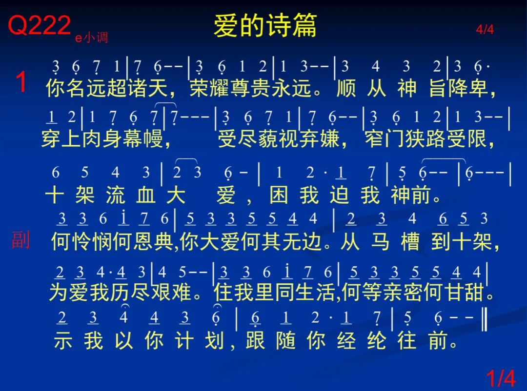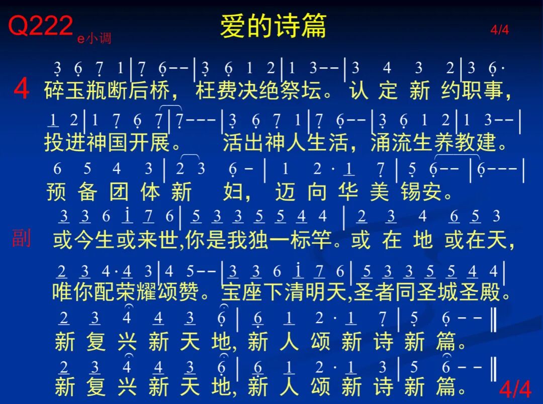 副:四 或今生或来世,你是我独一标杆。或在天或在地,唯你配荣耀颂赞。宝座下清明天,圣者同圣城圣殿。新复兴 新天地 新人颂新诗 新篇 新复兴 新天地 新人颂新诗 新篇