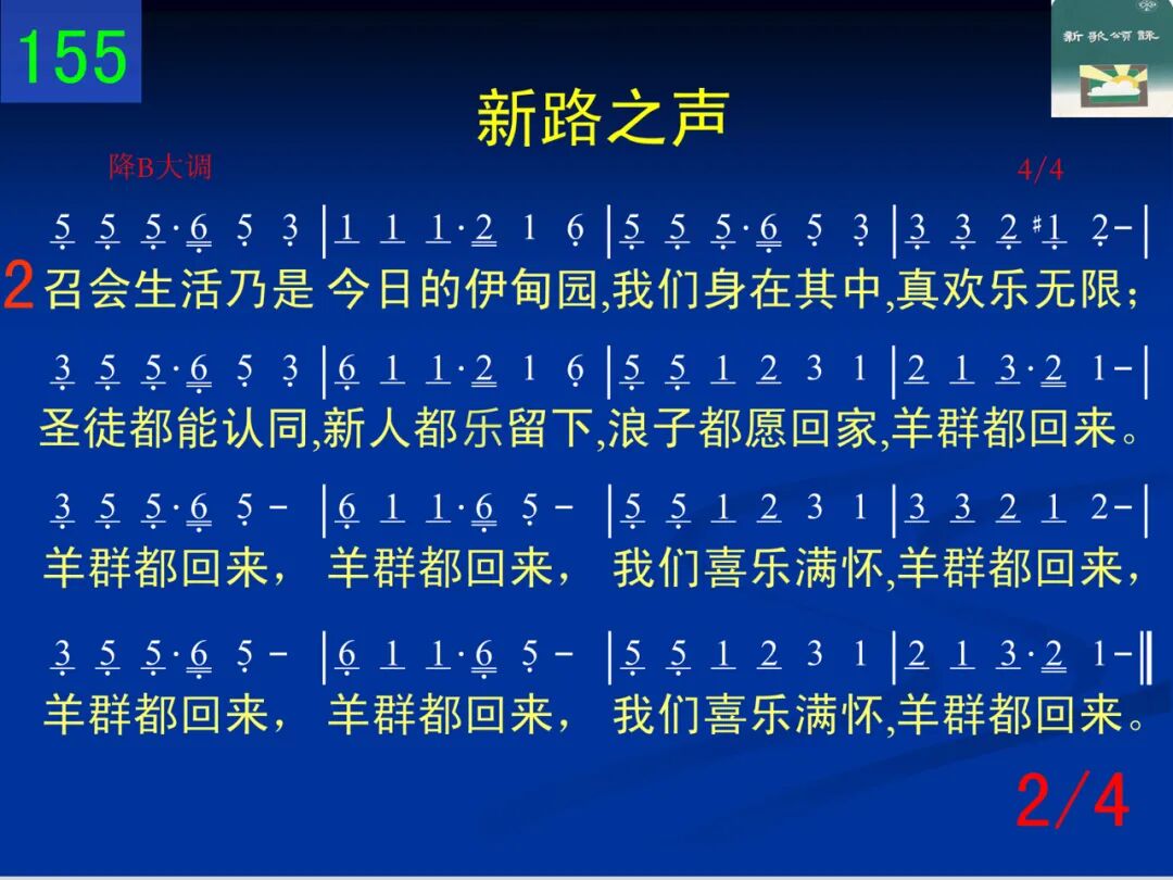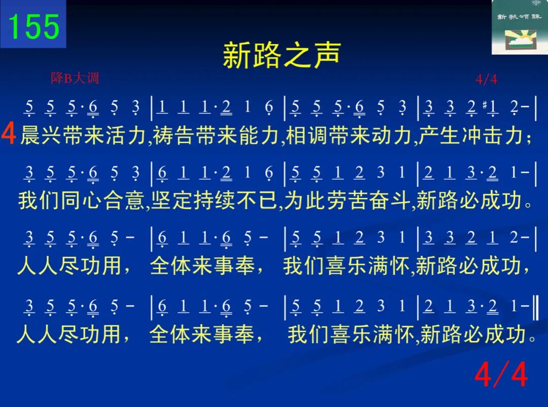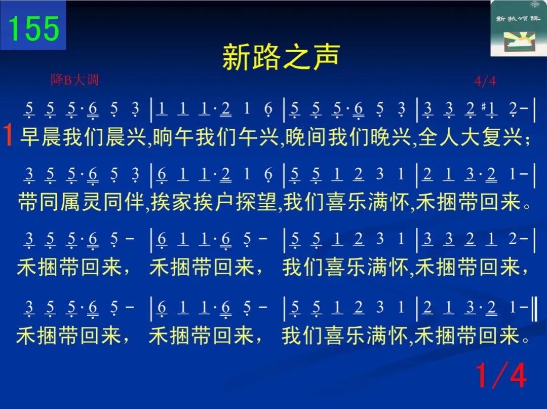早晨我们晨兴,晌午我们午兴,晚间我们晚兴,全人大复兴;带同属灵同伴,挨家挨户探望,我们喜乐满怀,禾捆带回来。禾捆带回来,禾捆带回来,我们喜乐满怀,禾捆带回来,禾捆带回来,禾捆带回来,我们喜乐满怀,禾捆带回来。 二 召会生活乃是今日的伊甸园,我们身在其中,真欢乐无限;圣徒都能认同,新人都了留下,浪子都愿回家,羊群都回来。羊群都回来,羊群都回来,我们喜乐满怀,羊群都回来,羊群都回来,羊群都回来,我们喜乐满怀,羊群都回来。 三 相信取代不信,神能取代不能,积极取代消极,神就显神迹;抓住圣灵同在,尊重圣灵主权,投进圣灵水流,活水就涌流。哦又新又活,新枝结新果,我们喜乐满怀,月月结美果,哦又新又活,新枝结新果,我们喜乐满怀,月月结美果。 四 晨兴带来活力,祷告带来能力,相调带来动力,产生冲击力;我们同心合意,坚定持续不已,为此劳苦奋斗,新路必成功。人人尽功用,全体来事奉,我们喜乐满怀,新路必成功,人人尽功用,全体来事奉,我们喜乐满怀,新路必成功,