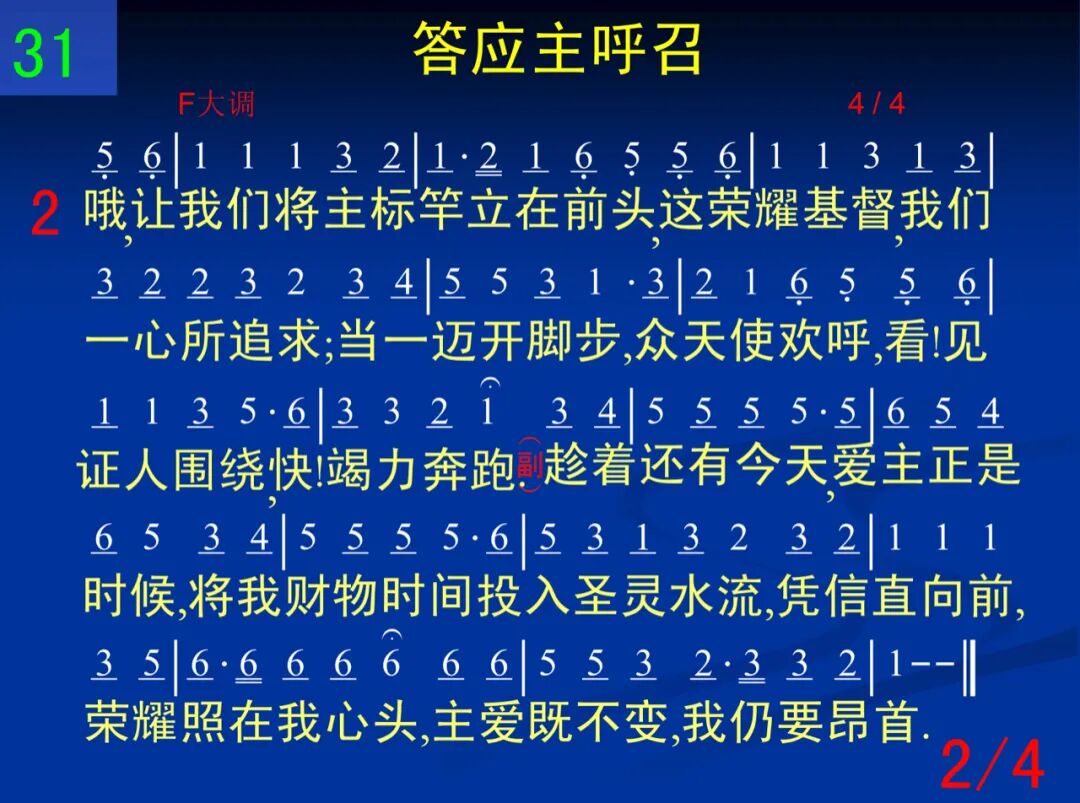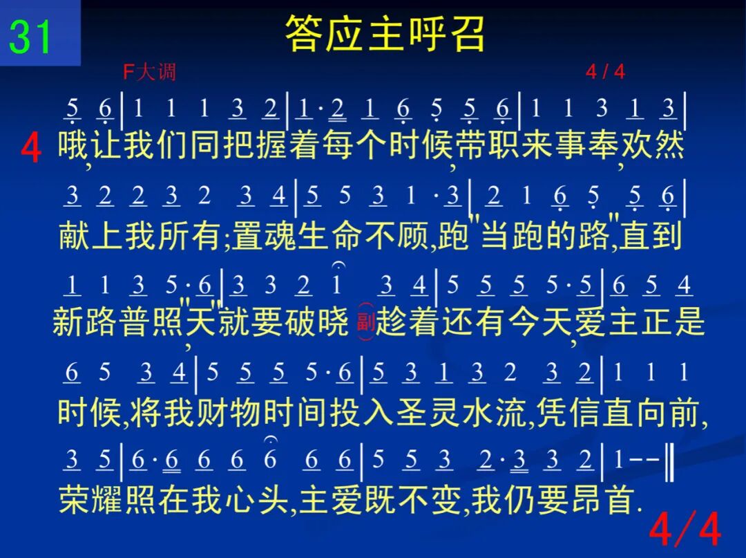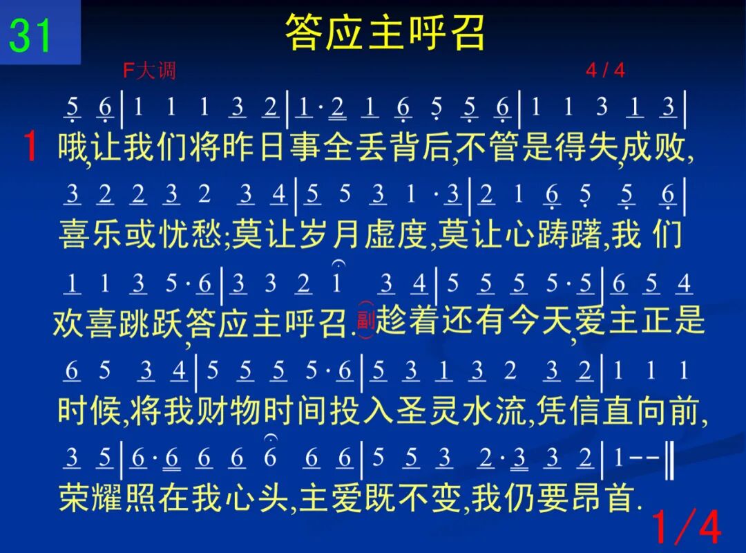 哦,让我们将昨日事全丢背后,不管是得失,成败,喜乐或忧愁;莫让岁月虚度,莫让心踌躇,我们欢喜跳跃,答应主呼召。 趁着还有今天,爱主正是时候,将我财物时间投入圣灵水流,凭信直向前,荣耀照在我心头,主爱既不变,我仍要昂首。 二 哦,让我们将主标竿立在前头,这荣耀基督,我们一心所追求;当一迈开脚步,众天使欢呼,看!见证人围绕,快!竭力奔跑。 趁着还有今天,爱主正是时候,将我财物时间投入圣灵水流,凭信直向前,荣耀照在我心头,主爱既不变,我仍要昂首。 三 哦,让我们都把一切交在主手,为祂我破碎心爱,不再有保留;看万事如粪土,来得着基督,“我的“全然倾倒,我要主“上好“ 趁着还有今天,爱主正是时候,将我财物时间投入圣灵水流,凭信直向前,荣耀照在我心头,主爱既不变,我仍要昂首。 四 哦,让我们同把握着每个时候,带职来事奉,欢然献上我所有;置魂生命不顾,跑“当跑的路“,直到新路普照,“天“就要破晓 趁着还有今天,爱主正是时候,将我财物时间投入圣灵水流,凭信直向前,荣耀照在我心头,主爱既不变,我仍要昂首。