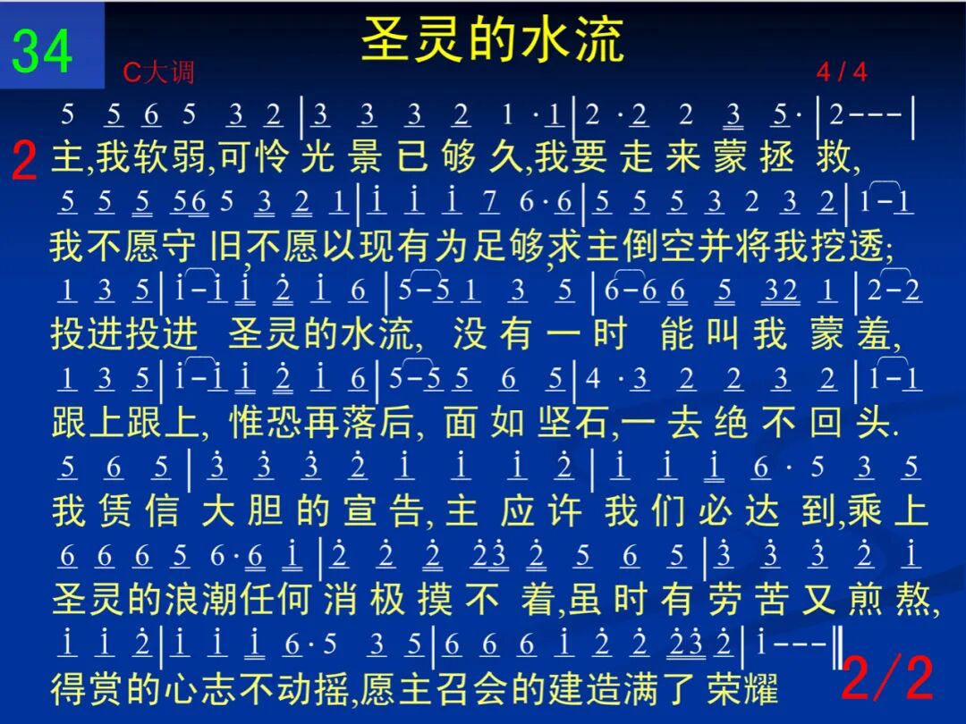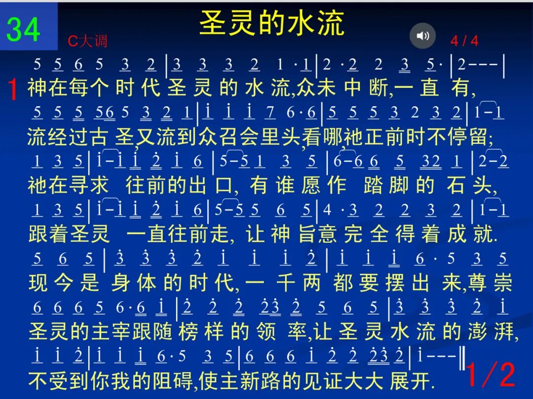 神在每个时代圣灵的水流,从未中断一直有,流经过古圣,又流到众召会里头,看哪,祂正前进不停留;祂在寻求往前的出口,有谁愿作踏脚的石头,跟着圣灵一直往前走,让神旨意完全得着成就。现今是身体的时代,一千两都要摆出来,尊崇圣灵的主宰,跟随榜样的领率,让圣灵水流的澎湃,不受到你我的阻碍,使主新路的见证大大展开。 二 主,我软弱,可怜光景已够久,我要起来蒙拯救,我不愿守旧,不愿以现有为足够,求主倒空并将我挖透;投进投进圣灵的水流,没有一事能叫我蒙羞,跟上跟上,惟恐再落后,面如坚石,一去绝不回头。我凭信大胆的宣告,主应许我们必达到,乘上圣灵的浪潮任何消极摸不着,虽时有劳苦又煎熬,得赏的心志不动摇,愿主召会的建造满了荣耀