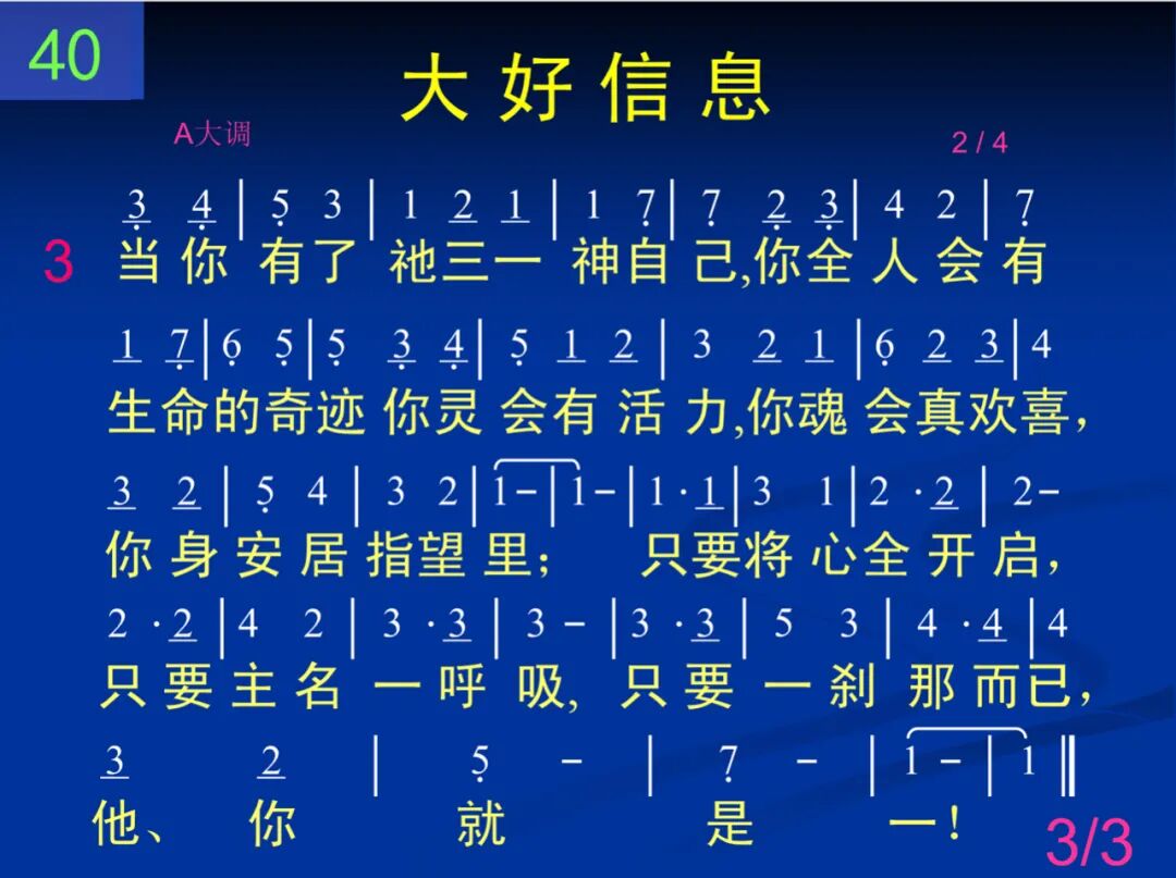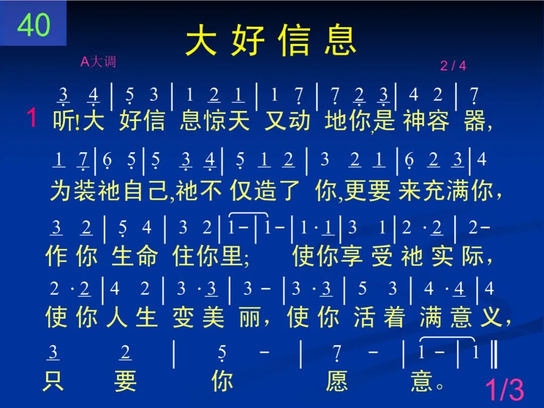 听!大好信息,惊天又动地,你是神容器,为装祂自己,祂不仅造了你,更要来充满你,作你生命住你里;使你享受祂实际,使你人生变美丽,使你活着满意义,只要你愿意。 二 过去荣耀里祂早拣选你,因爱的催逼为你亲来地,十架上被举起,经死亡祂复起,今特来寻找你;要将活神带给你,要将生命分给你,要将恩典赐给你,使你心满意! 三 当你有了祂三一神自己,你全人会有生命的奇迹;你灵会有活力,你魂会真欢喜,你身安居指望里;只要将心全开启,只要主名一呼吸,只要一刹那而已,祂、你就是一!