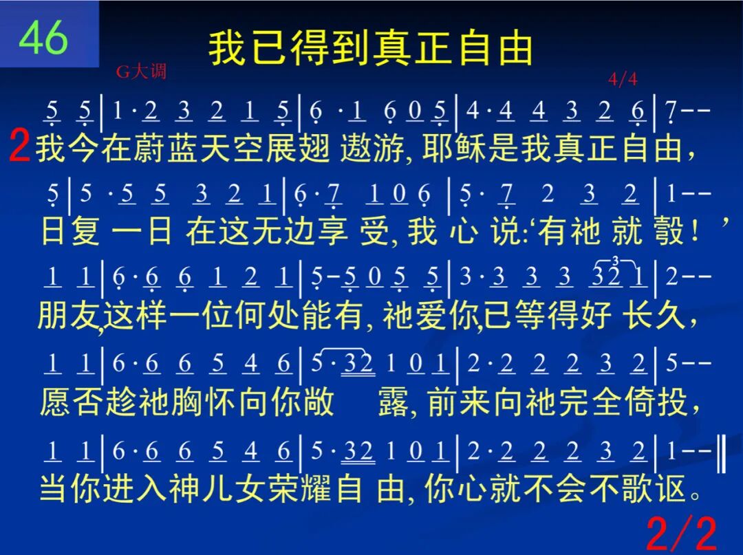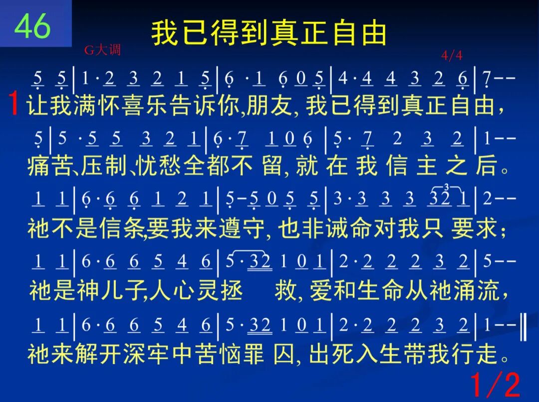 让我满怀喜乐告诉你,朋友,我已得到真正自由,痛苦,压制,忧愁全都不留,就在我信主之后;祂不是信条要我来遵守,也非诫命对我只要求,祂是神儿子,人心灵拯救,爱和生命众祂涌流,祂来解天深牢中苦恼罪囚,出死入生带我行走。 二 我今在蔚蓝天空展翅遨游,耶稣是我真正自由,日复一日在这无边享受,我心说,有祂就够!朋友,这样一位何处能有,祂爱你,已等得好长久,愿否趁祂胸怀向你敞露,前来向祂完全倚投,当你进入神儿女荣耀自由,你心就不会不歌讴。