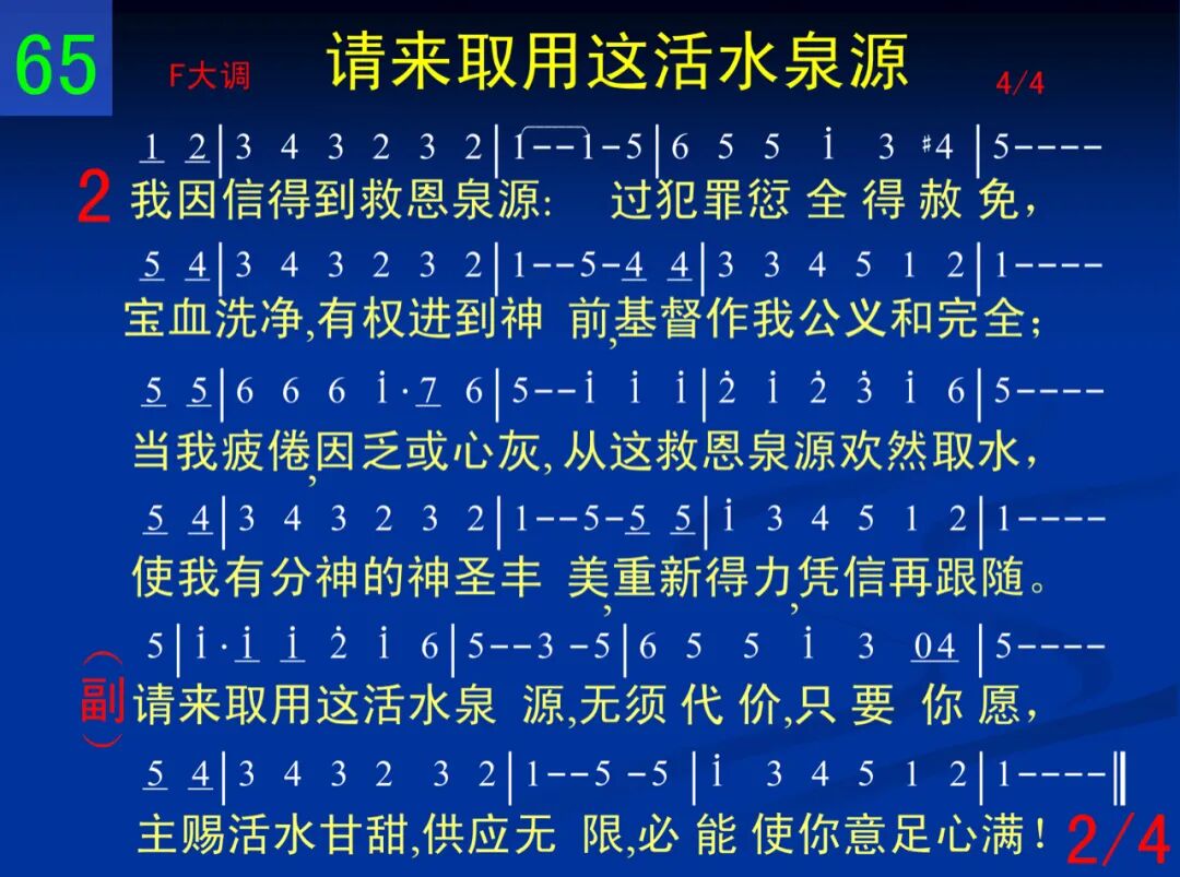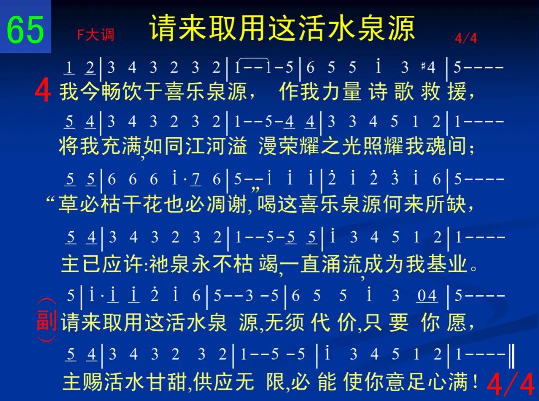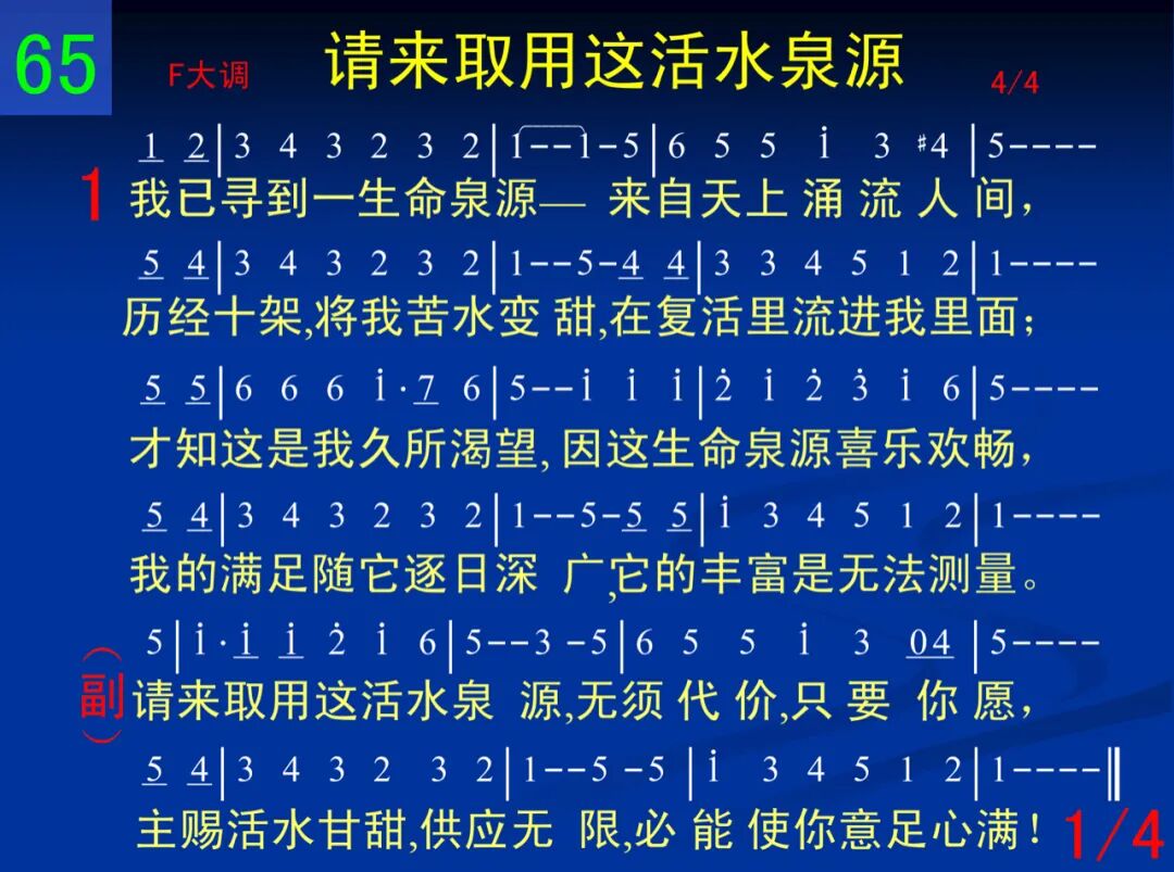 我已寻到一生命泉源—来自天上涌流人间,历经十架,将我苦水变甜,在复活里流进我里面;才知这是我久所渴望,因这生命泉源喜乐欢畅,我的满足随它逐日深广,它的丰富是无法测量。 请来取用这活水泉源,无须代价,只要你愿,主赐活水甘甜,供应无限,必能使你意足心满! 二 我因信得到救恩泉源:过犯罪愆全得赦免,宝血洗净,有权进到神前,基督作我公义和完全;当我疲倦,因乏或心灰,从这救恩泉源欢然取水,使我有分神的神圣丰美,重新得力,凭信再跟随。 请来取用这活水泉源,无须代价,只要你愿,主赐活水甘甜,供应无限,必能使你意足心满! 三 我常来到这医治泉源,照我本相寻求爱怜,它的供应充盈温柔超凡,胜过地上人来的恩典;它是我每日生活秘诀,为这医治泉源满心感谢,愿我所有在此一一了结,主来居衷,并作我一切。 请来取用这活水泉源,无须代价,只要你愿,主赐活水甘甜,供应无限,必能使你意足心满! 四 我今畅饮于喜乐泉源,作我力量诗歌救援,将我充满,如同江河溢漫,荣耀之光照耀我魂间;“草必枯干花也必凋谢,”喝这喜乐泉源何来所缺,主已应许:祂泉永不枯竭,一直涌流,成为我基业。 请来取用这活水泉源,无须代价,只要你愿,主赐活水甘甜,供应无限,必能使你意足心满!