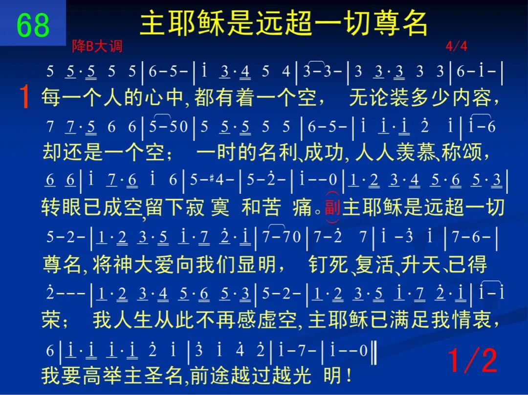 每一个人的心中,都有着一个空,无论装多少内容,却还是一个空;一时的名利、成功,人人羡慕、称颂,转眼已成空,留下寂寞和苦痛。 主耶稣是远超一切尊名,将神大爱向我们显明,钉死、复活、升天、已得荣;我人生从此不再感虚空,主耶稣已满足我情衷,我要高举主圣名,前途越过越光明! 二 你是神造的器皿,你乃万物之灵,形像、样式与神同,身分、地位尊崇;你若肯呼喊主名,接受祂作生命,祂就必进入你灵,温暖你心情。 主耶稣是远超一切尊名,将神大爱向我们显明,钉死、复活、升天、已得荣;我人生从此不再感虚空,主耶稣已满足我情衷,我要高举主圣名,前途越过越光明!