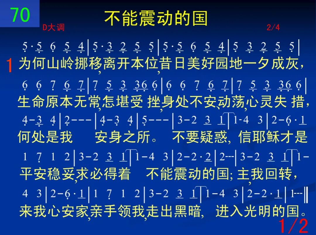 为何山岭挪移,离开本位,昔日美好园地一夕成灰,生命原本无常,怎堪受挫,身处不安、动荡,心灵失措,何处是我安身之所。不要疑惑,信耶稣才是平安稳妥,求必得着不能震动的国;主,我回转,来我心安家,亲手领我,走出黑暗,进入光明的国。 二 我们虽是不堪,却蒙拣选,天地纵然改迁,主爱不变,祂曾死过,担当你我愆尤,祂已复活,今来施恩拯救,除祂以外,别无可求。向主依投,有祂我不再惊骇、失落,同来领受不能震动的国;在神国里,充满着公义,和平、喜乐,我心安息,主与我永联合。