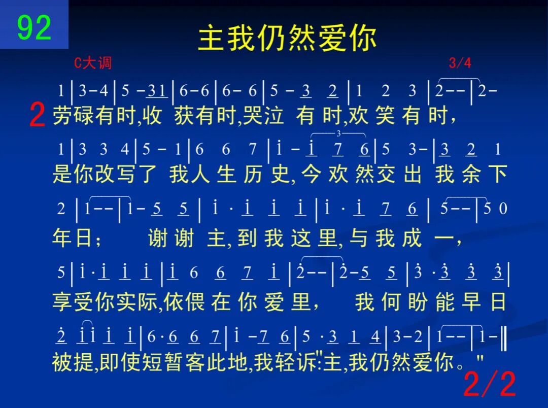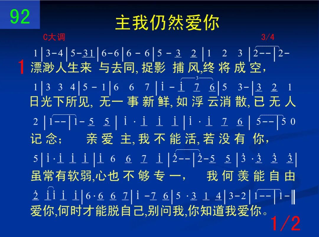 漂渺人生来与去同,捉影捕风,终将成空,日光下所见,无一事新鲜,如浮云消散,已无人记念;亲爱主,我不能活,若没有你,虽常有软弱,心也不够专一,我何羡能自由爱你,何时才能脱自己,别问我,你知道我爱你。 二 劳碌有时,收获有时,哭泣有时,欢笑有时,是你改写了我人生历史,今欢然交出我余下年日;谢谢主,到我这里,与我成一,享受你实际,依偎在你爱里,我何盼能早日被提,即使短暂客此地,我轻诉:“主,我仍然爱你。“